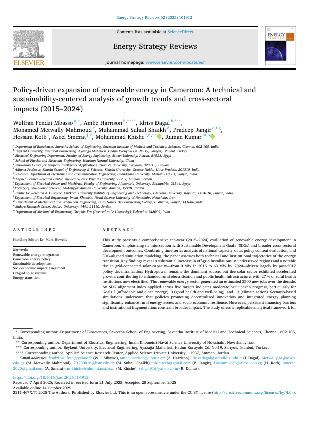 Description: This study presents a comprehensive ten-year (2015–2024) evaluation of renewable energy development in Cameroon, emphasizing its intersection with Sustainable Development Goals (SDGs) and broader cross-sectoral development outcomes. Combining time-series analysis of national capacity data, policy content evaluation, and SDG-aligned simulation modeling, the paper assesses both technical and institutional trajectories of the energy transition. Key findings reveal a substantial increase in off-grid installations in underserved regions and a notable rise in grid-connected solar capacity—from 0 MW in 2015 to 63 MW by 2024—driven largely by post-2017 policy decentralization. Hydropower remains the dominant source, but the solar sector exhibited accelerated growth, contributing to enhanced rural electrification and public health infrastructure, with 27 % of rural health institutions now electrified. The renewable energy sector generated an estimated 3500 new jobs over the decade. An SDG alignment index applied across five targets indicates moderate but uneven progress, particularly for Goals 7 (affordable and clean energy), 3 (good health and well-being), and 13 (climate action). Scenario-based simulations underscore that policies promoting decentralized innovation and integrated energy planning significantly enhance rural energy access and socio-economic resilience. However, persistent financing barriers and institutional fragmentation constrain broader impact. The study offers a replicable analytical framework for data-driven, SDG-oriented assessment of energy transitions in Sub-Saharan Africa, contributing actionable insights for sustainable energy policy design in low-resource contexts.