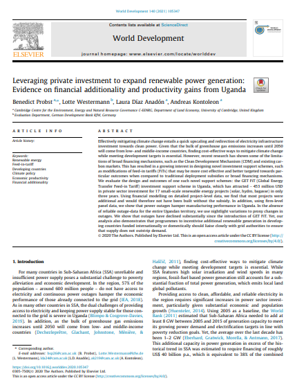 Description: This paper describes the findings from the very first application of a new methodology to support governments and development partners that wish to mobilise private finance for climate-compatible development (CCD). Piloting this methodology in Uganda’s energy sector allowed us to make two distinct sets of findings that are useful for actors seeking to mobilise private climate finance.