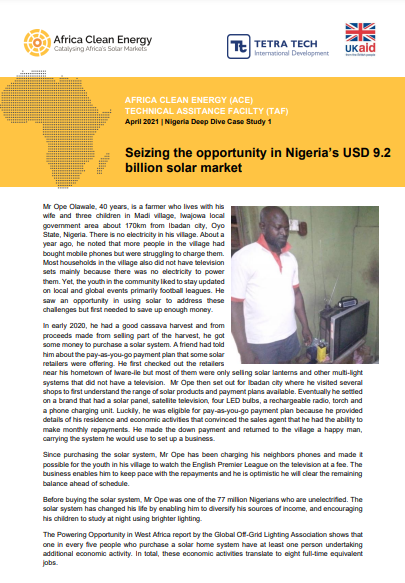 Description: Mr Ope Olawale, 40 years, is a farmer who lives with his wife and three children in Madi village, Iwajowa local government area about 170km from Ibadan city, Oyo State, Nigeria. There is no electricity in his village. About a year ago, he noted that more people in the village had bought mobile phones but were struggling to charge them. Most households in the village also did not have television sets mainly because there was no electricity to power them. Yet, the youth in the community liked to stay updated on local and global events primarily football leagues. He saw an opportunity in using solar to address these challenges but first needed to save up enough money.